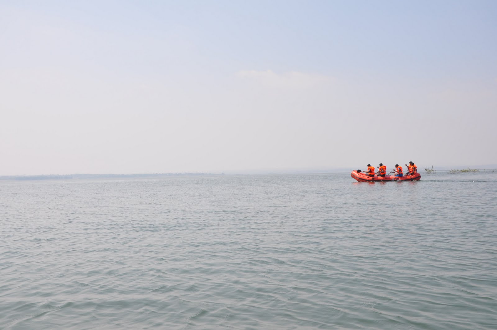 After having lunch, all of us headed back to the camp site. Avani & I were always walking in the long route to the camp, wondering how everyone else got here so quickly. We got to know about the hole in the fence only now! My rafting team and our instructor realized that we didn’t learn the rescue technique in case the raft tilts upside down! So we took a raft and the five of us with the instructor, went into the water and got into our raft. It was very windy! We struggled a lot just to row around 200mts away from the camp. Vinod told all of us to stand on one side of the raft and he held a rope which was tied to the raft in his hand. Due to the shift in weight, the raft went upside down! Once we were all in the water, Vinod (with the rope still in his hand) and another teammate got onto the tilted raft. Once the two of them on the upside down raft went to the opposite side of where the rope was tied to the raft, Vinod pulled the rope as the raft tilted due to the shift in equilibrium, and two others clung on to the raft and ended up inside it when the raft was in position and helped the rest of us inside the raft! It was a superb concept! JI was amazed! J Since it was too windy, we tried it just once more as the wind kept pushing our raft to the shore, after which we went back to the camp, lifted the raft out of water and parked it on the bank. Nanda, Krishna & Raagu had to leave to Bangalore that day itself. After we bid them goodbye, Avani & I went back for a swim. Manju sir was wind surfing and as usual Avani was in aweJ Manju sir offered to let Avani sit on the deck and took her for a ride after which all of us got our turns. I felt I was zooming sitting on water surface! J It felt awesome and now I was dying to learn how to surf, just like Avani J