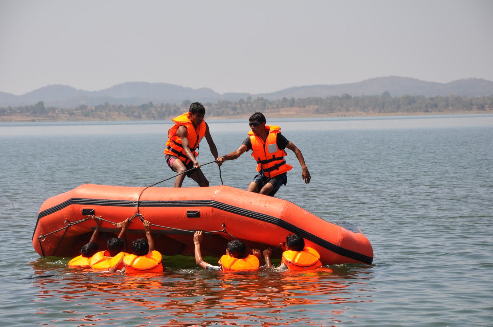 Rescue technique when a raft goes upside down |