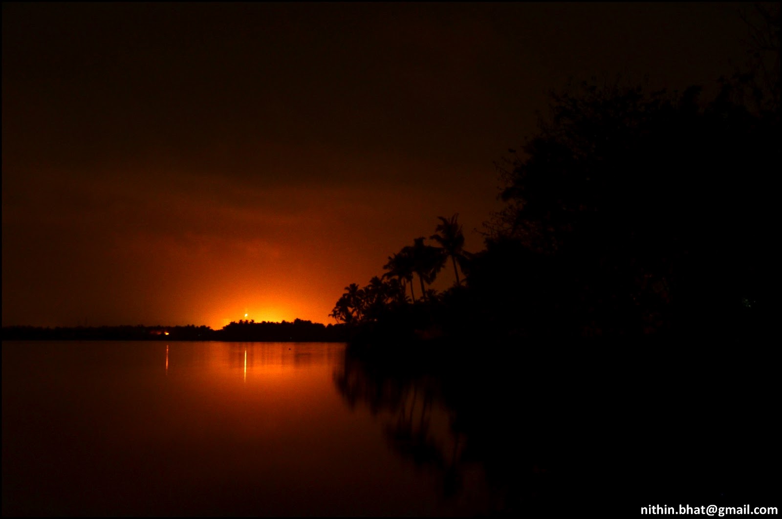 It was time for me to head back. I reluctantly got up and walked in and out of the water and stood in it. The twilight colors were beautiful :) The sky was pinkish orange and the water was reflecting the color in the sky :) I stood in the beautifully colored water and enjoyed the 360 degree view around me :) It was time to say bye to the sea. I reluctantly walked back, slipping into two slippers which were not matching and reached the raft. The sky was clear today and I could see a few stars. Once we reached the ashram, I hopped out of the raft along with the others. Dhruva was going back to the other side to get the rest of them and I hopped back into the raft :) The motor had been making a noise from noon. I asked Dhruva if we would reach back with the help of the motor or if we would have to paddle our way back. He said it would be hard to paddle back and told me one of his adventurous stories. Once he and another swami were on their way to the ashram upstream and it was pouring cats and dogs at night when the motor gave up. No matter how much they paddled, they were unable to go upstream and hence they went to the nearest land and wait there till dawn. It sounded adventurous only because they were safe in the end! I was sure that even if the motor gave up then, we would be able to paddle ourselves upstream today :) I could see light flashing on and off from the fishing and dredging areas and asked Dhruva if it was our people, but he told me that was the light flashing from the poles just to indicate that it was dredging/fishing area. He now pointed out to our far right and I could see the silhouette of our people. All of them hopped into the raft and we were on our way to the Ashram on the noisy raft which moved even more slowly due to the additional weight and we were going upstream. I turned back and started into the darkness and saw flashes of light here and there. I asked Dhruva if there was a light house there and he said there was. Dhruva was telling us that the dredging was being done mainly to allow ships to move in the river. I had thought it was being done to save the village from drowning if the water level increased. When we reached the Ashram, I was glad we didn’t have to paddle our way to it :)